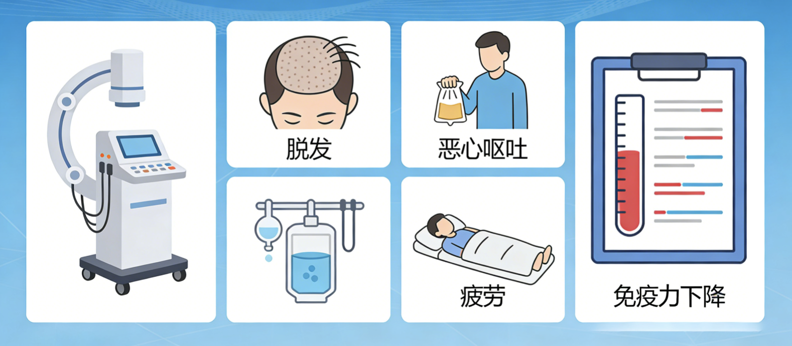 放化疗是临床治疗癌症的常用手段,能有效杀灭癌细胞、控制肿瘤进展,但同时也会对身体正常细胞造成损伤,引发一系列副反应,比如恶心呕吐、精神萎靡、食欲不振、浑身乏力、脱发、白细胞减少等。